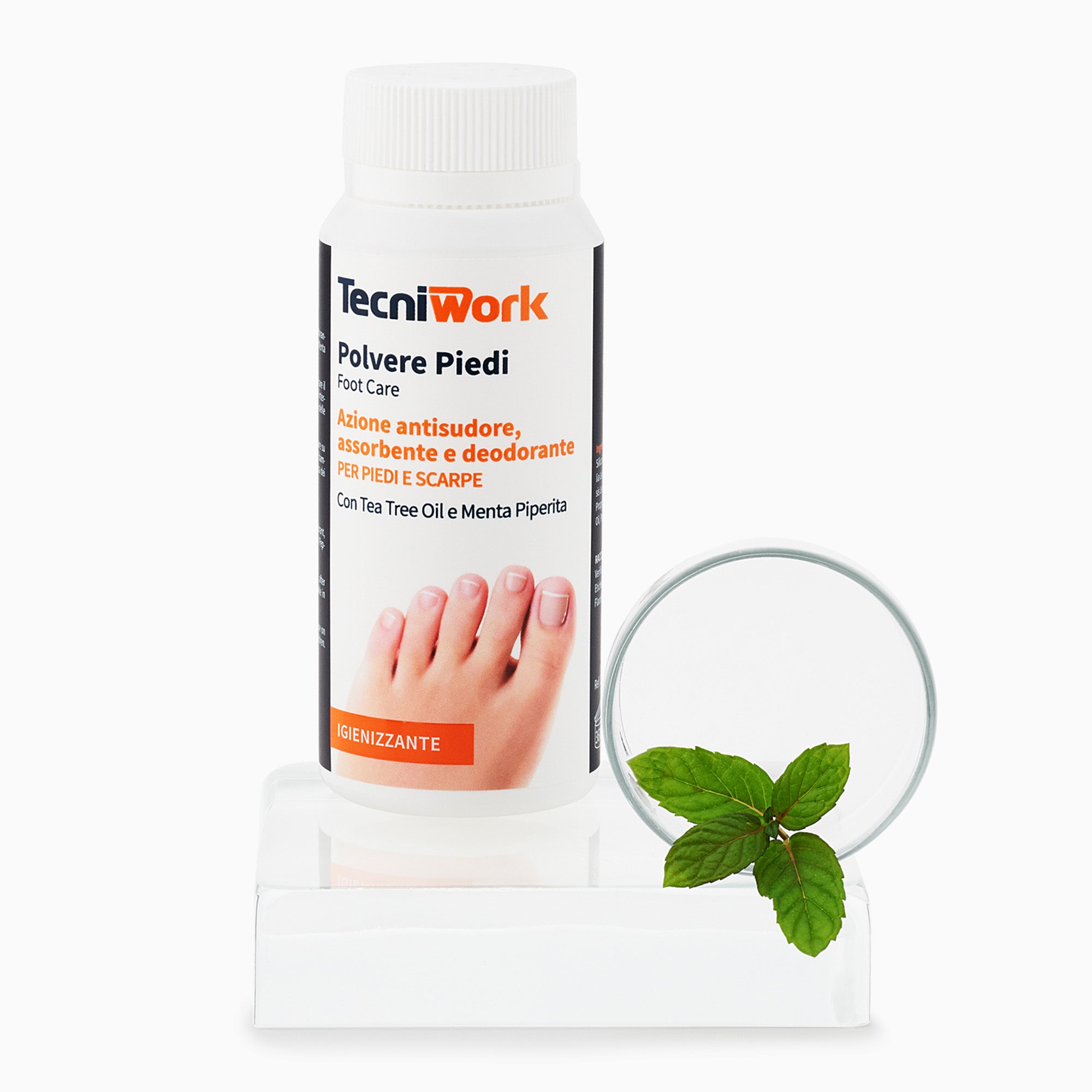 • Pó para pés higienizante, desodorizante, absorvente e refrescante